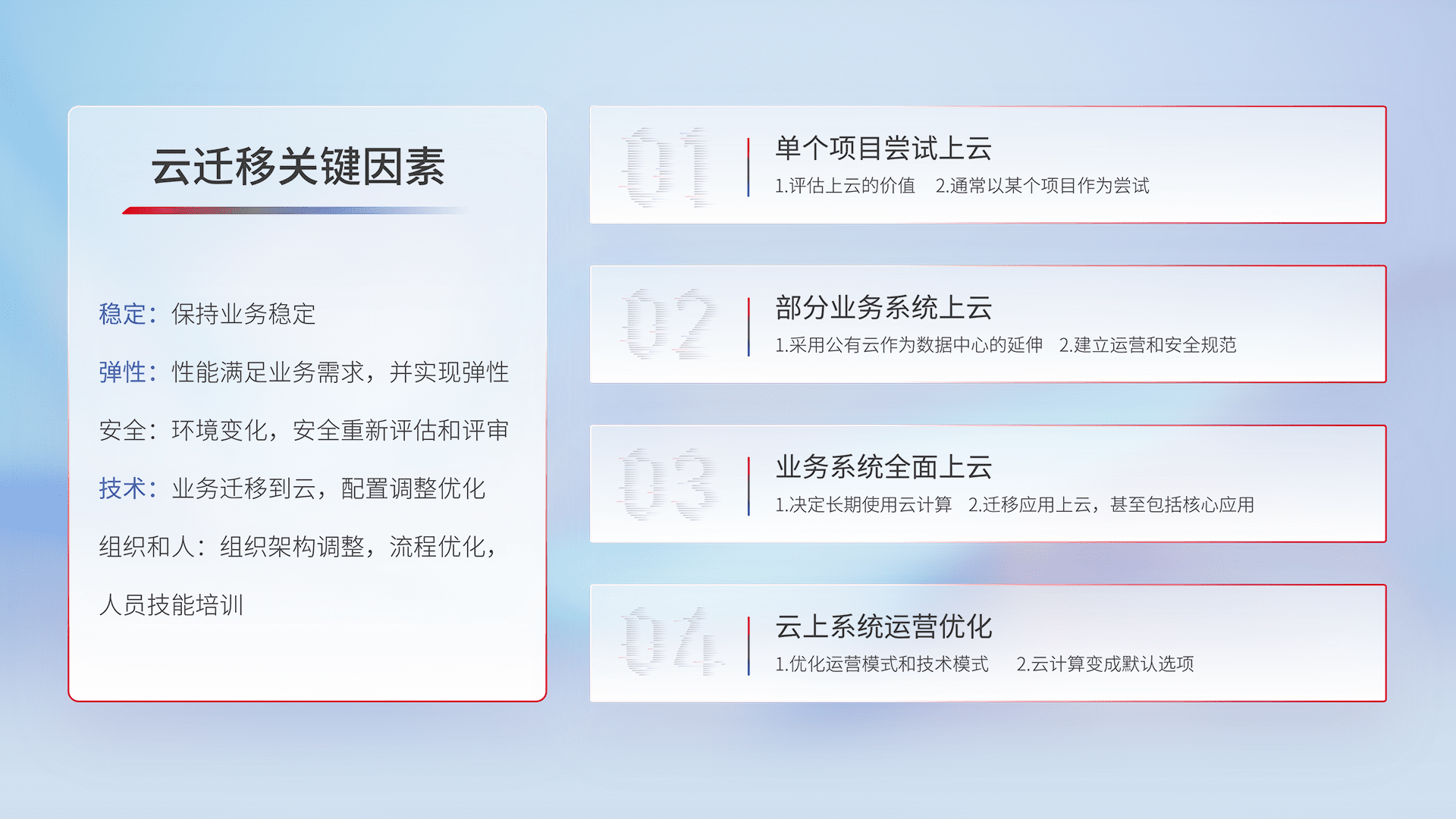 结合实际业务,,,,从规划设计、、、、云平台选型、、云原生改造、、数据迁移、、集成交付,,,迁移全过程为客户识别最佳上云路径,,,做好风险识别管理,,,,设计网络架构、、身份权限、、、、安全审计合规、、操作审计、、日志审计、、监控告警策略、、、多站点容灾设计等,,,对云上基础设施进行整体规划,,,提升IT治理水平,,,以满足弹性、、高可用、、、、高性能的需求。。