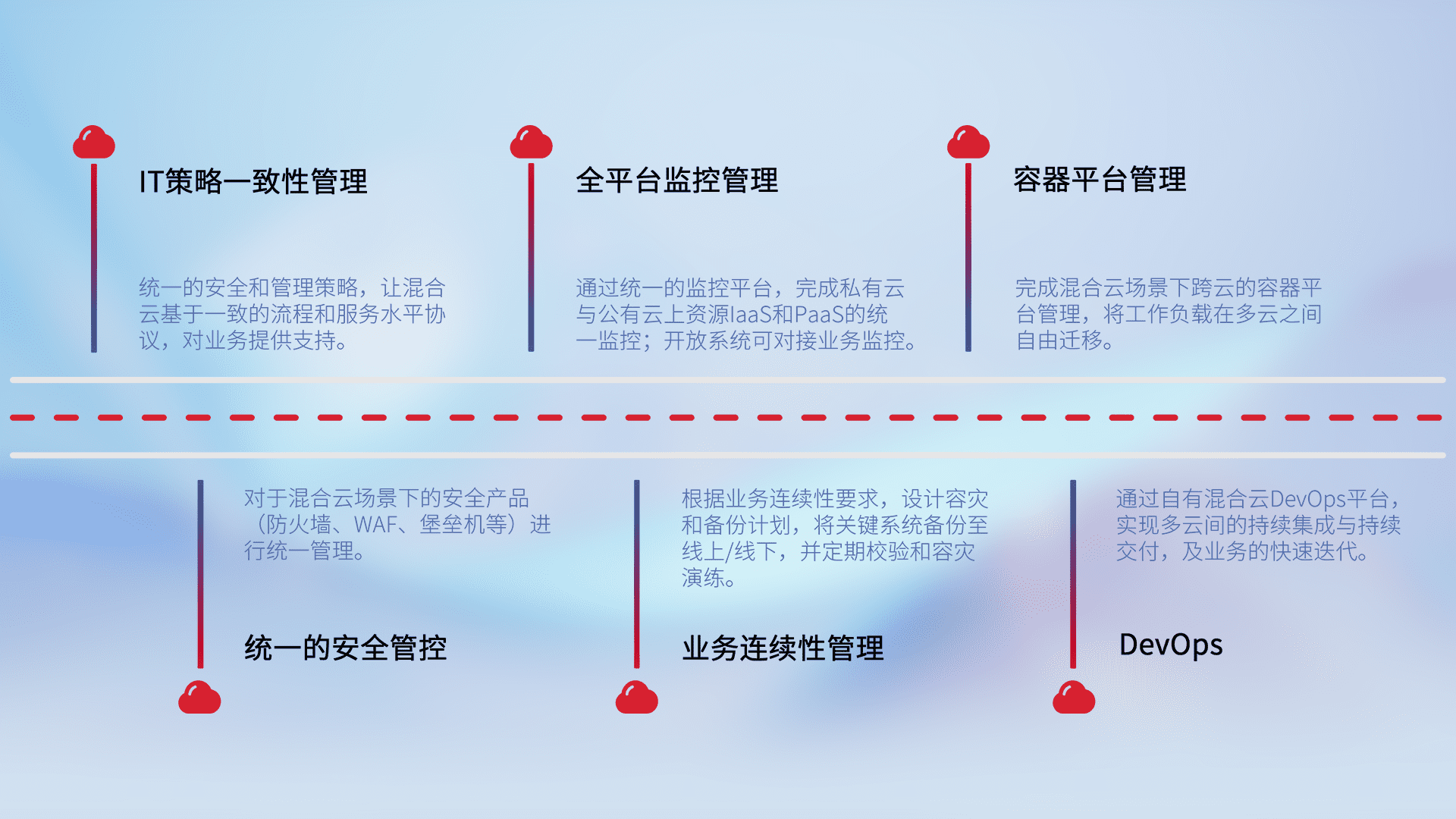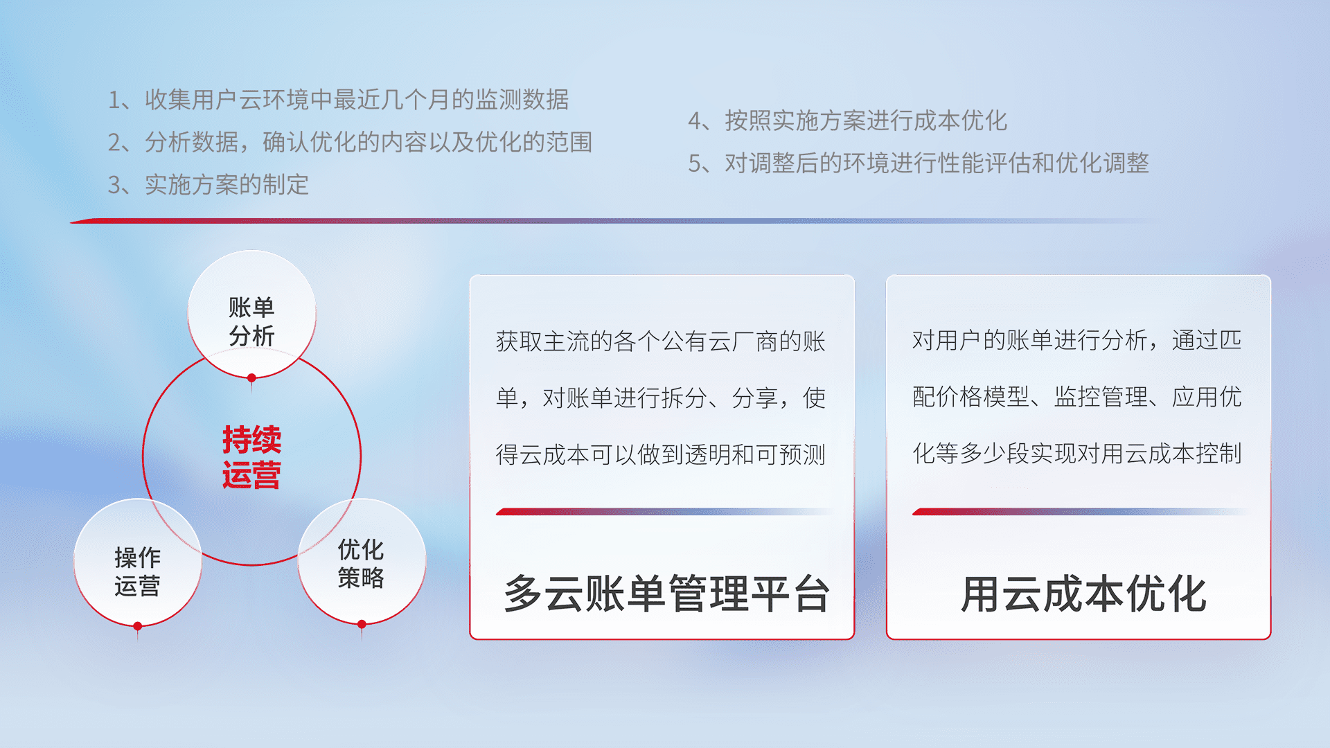 通过多云纳管,,,以统一的资源数据模型把客户的云资源进行抽象和封装,,,进而实现对多云资源的统一操作,,,保障云资源管理的可靠性、、、、稳定性与可用性。。。量身定制化运维内容,,,,配置、、开发运维、、、补丁管理、、备份、、、、监控、、、、认证和访问管理、、、审计和日常巡检等,,,保障在用云过程中的可靠度,,,稳定度以及高可用率。。。
