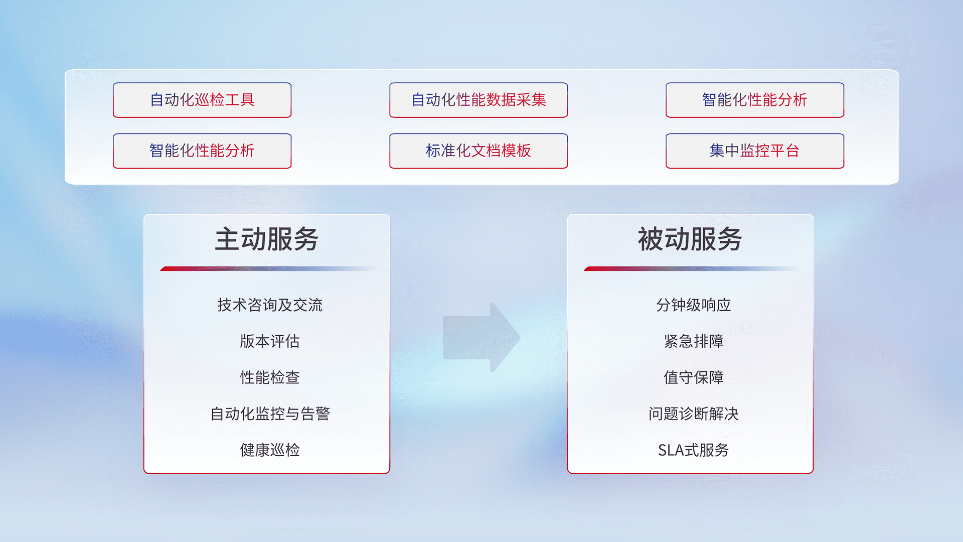 智能化工具和标准化文档,,,保障服务质量,,提供主动服务(包含技术咨询、、、版本评估、、、性能检查、、、、自动化监控与告警、、、、健康巡检)和被动服务包含(分钟级响应、、紧急排障、、值守保障、、、、问题诊断解决、、、SLA服务)。。。